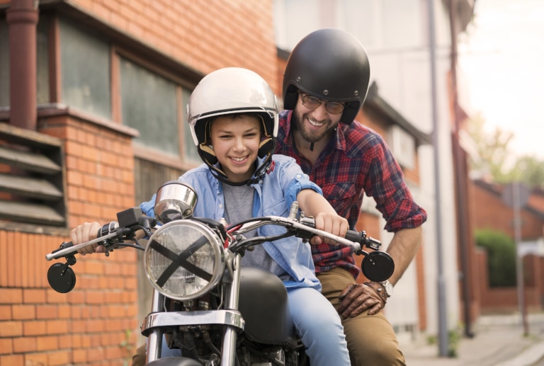 - Show your child how to sit properly and remind them to stay seated and to not attempt to stand or jump off the motorcycle while riding.