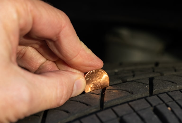 Driving on tires with a tread depth of less than 2⁄32-in. in Louisiana is illegal. A quick and easy way to measure this is using the “penny” test. Take a penn and place it in the tread of your tire with Lincoln’s head facing down. If Lincoln’s forehead is covered, you still have a safe amount of tread left. However, if all of Lincoln’s head is visible, the tread on your tires is less than 2/23-in. deep and your tires need to be replaced.